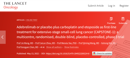 北京时间2022年5月14日,PA视讯医药自主研发的PD-L1抑制剂阿得贝利单抗治疗广泛期小细胞肺癌的III期临床研究(CAPSTONE-1研究)成果正式全文在线发表于国际权威学术期刊《柳叶刀·肿瘤学》(《THE LANCET Oncology》,影响因子41.316)。CAPSTONE-1研究结果显示,阿得贝利单抗联合化疗一线治疗广泛期小细胞肺癌相较于安慰剂联合化疗可以显著延长患者总生存期至15.3个月[1],刷新现有免疫药物一线治疗广泛期小细胞肺癌的总生存纪录[2]