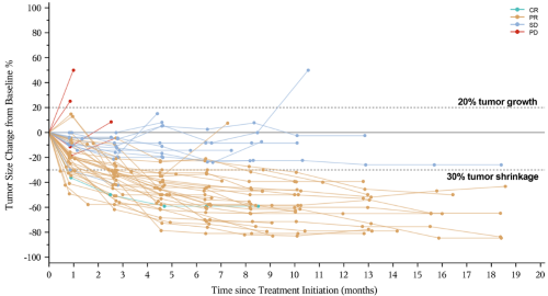 中位治疗持续时间为9.2个月(图4)。在研究期间,5例患者的病灶变为可切除,因此他们停止了治疗并接受了手术;术后发现有1例患者达到病理缓解(pCR)。这5例患者中有4例(包括1例术前CR)仍无疾病进展,1例术后10个月疾病复发。