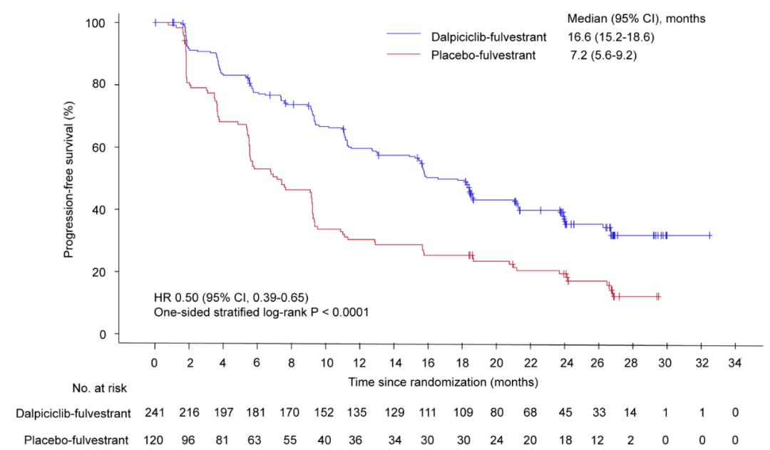 这些特性在DAWNA-1[2]和DAWNA-2[3]两项研究中也有体现。DAWAN-1研究是一项在既往内分泌治疗进展的HR+的晚期乳腺癌开展的Ⅲ期随机对照研究,对比了达尔西利联合氟维司群与单药氟维司群的疗效,结果显示,PFS延长9.4个月(16.6 vs. 7.2个月),HR=0.50,降低了50%的疾病进展风险,展现了达尔西利联合氟维司群在二线治疗的重要地位(图2)。该结果已经发表在《自然医学》(Nature Medicine,影响因子82.9)。