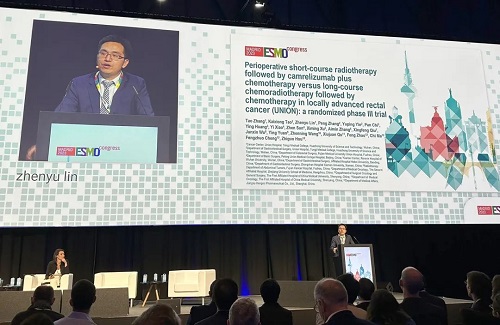10月21日,PA视讯医药创新药卡瑞利珠单抗(艾瑞卡®)的一项研究“新辅助短程放疗序贯卡瑞利珠单抗联合化疗对比长程放化疗序贯化疗治疗局部晚期直肠癌”随机对照Ⅲ期试验(UNION) 以优选口头报告的形式正式亮相。该研究由华中科技大学同济医学院附属协和医院张涛教授、陶凯雄教授担任主要研究者,华中科技大学同济医学院附属协和医院林振宇教授在马德里现场报告了该重磅研究的结果1,此项研究是全球首个评估短程放疗序贯免疫治疗联合化疗治疗局部晚期直肠癌的Ⅲ期研究,已达到主要终点病理完全缓解(pCR),有望为直肠癌患者的治疗提供新策略。