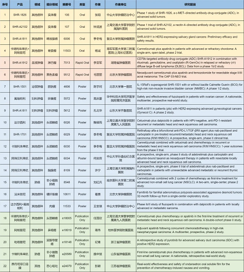 在肺癌、妇科肿瘤、淋巴瘤、膀胱癌、头颈肿瘤、黑色素瘤、肉瘤、鼻咽癌、脊索瘤、唾液腺癌、胸腺癌、硬纤维瘤、涎腺导管癌等其他多个疾病领域,卡瑞利珠单抗、阿帕替尼、阿得贝利单抗、吡咯替尼、达尔西利、氟唑帕利、法米替尼、SHR-1501、瑞拉芙普-α(SHR-1701)、SHR-1826、瑞康曲妥珠单抗(SHR-A1811)、SHR-A1912、SHR-A2102等抗肿瘤创新药相关研究一共入选了4项口头报告、2项快速口头报告、11项壁报展示和4项线上发表,彰显了PA视讯医药强劲的研发实力。此外,昂丹司琼口溶膜在防治化疗导致的恶心呕吐方面展现出了良好的疗效,本次ASCO年会有1项研究线上发表。