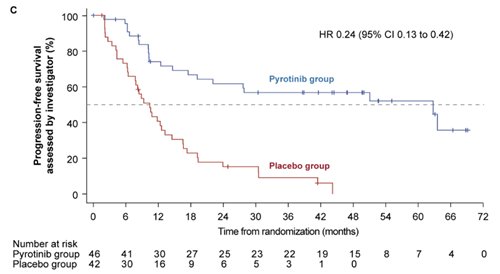 PHILA研究为一项随机、双盲、多中心、安慰剂对照的Ⅲ期临床研究,共纳入590例未经系统治疗的HER2阳性转移性乳腺癌患者,患者按1:1随机分配至试验组(PyroHT,n=297)和对照组(HT,n=293),并根据既往(新)辅助曲妥珠单抗治疗(是 vs. 否)和激素受体状态(ER和/或PR阳性 vs. ER和PR阴性)进行分层。主要研究终点为研究者评估的PFS,次要研究终点包括PFS(独立评审委员会评估)、OS、客观缓解率(ORR)、肿瘤缓解持续时间(DoR)、临床获益率(CBR)和安全性。